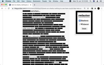 redactor เป็นส่วนขยายของ Chrome ฟรีที่พัฒนาโดย Christopher Fenwick ที่ช่วยให้ผู้ใช้สร้างกลอนที่ถูกลบออกจากเว็บไซต์ได้ เครื่องมือที่ไม่เหมือนใครนี้จะช่วยให้เนื้อหาออนไลน์เปลี่ยนเป็นคำกลอนได้อย่างสร้างสรรค์